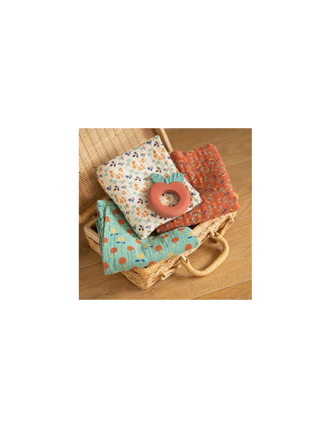 La collection Pomme des bois est illustrée par Elodie Coudray. Dessiné à la craie grasse, l’univers joyeux et poétique de cette collection se déploie comme un album de souvenirs d’enfance, cueillis au fil des saisons: la joie de découvrir un petit coin plein de fraises dont on remplit ses poches, le plaisir de grimper aux arbres, l’odeur de la mousse fraîche… La rencontre du coton naturel (en lange, velours éponge et jersey) avec les couleurs des sous-bois crée une collection tendre et pleine de spontanéité. Sans oublier une discrète touche rétro grâce au motif vichy et à ce bleu vibrant qui rappelle la couleur des baies. Panier sous le bras, suivez Anatole l’âne et Harry l’écureuil sur les petits chemins boisés, pour une cueillette de trésors colorés…