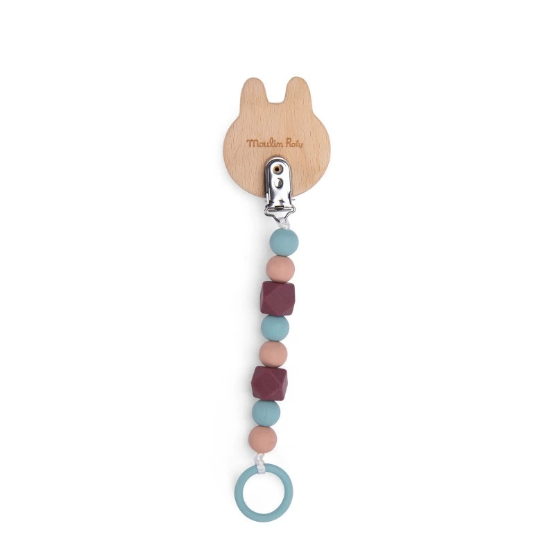 L’attache-sucette en bois et silicone Après la pluie par Moulin Roty est constituée d’une succession de perles rondes en silicone. Elle dispose d’une pince ajustable à une extrémité, pour s’accrocher aisément aux vêtements de votre bout de chou, au harnais de sa poussette ou de son siège auto, et d’un anneau à l’autre bout, afin de tenir fermement la sucette. Vous écartez ainsi tout risque de voir le précieux objet tomber au sol ou être perdu !