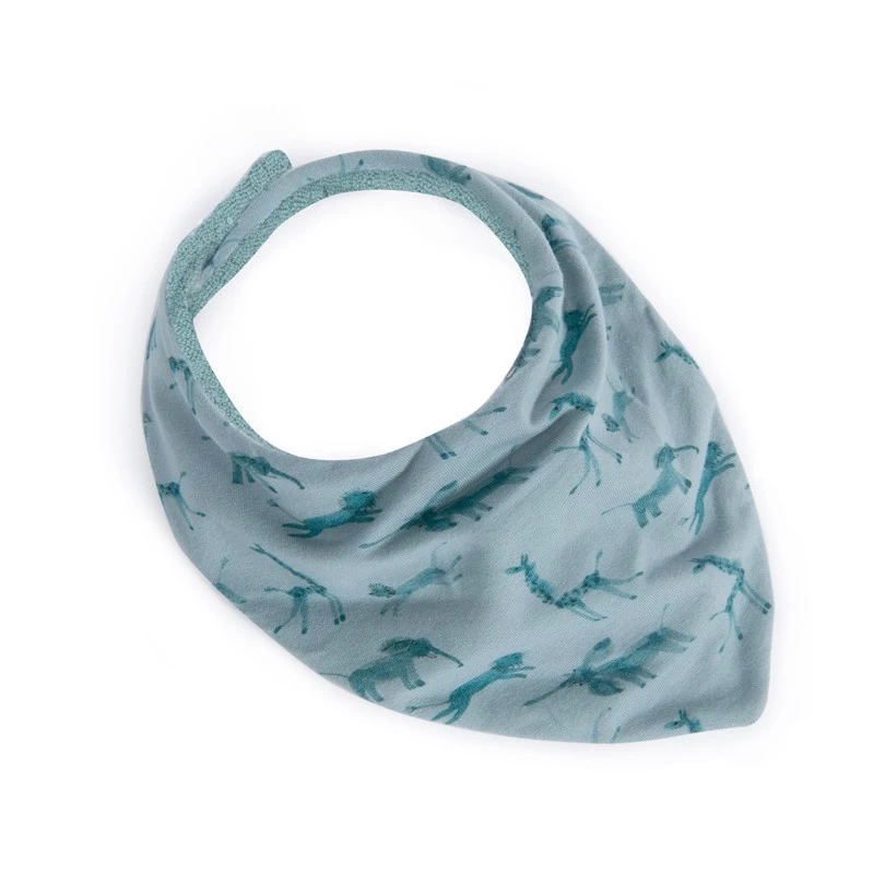 Le bavoir bandana bleu Sous mon baobab Moulin Roty s’installe autour du cou de bébé et se fixe aisément à l’arrière par deux pressions, sans rien avoir à enfiler. Il est composé d’un côté en éponge bouclette bleu, et d’un côté en jersey imprimé d’animaux de la savane, tendres et graphiques dans un joli dégradé de bleu.