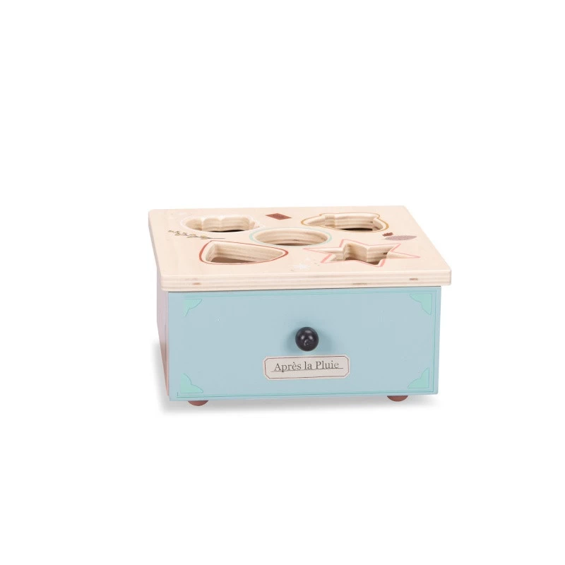 Magnifiquement illustrée du petit chat de la collection, la boite à forme Après la pluie par Moulin Roty est un très beau jouet pour suivre bébé dans toutes ses expériences.