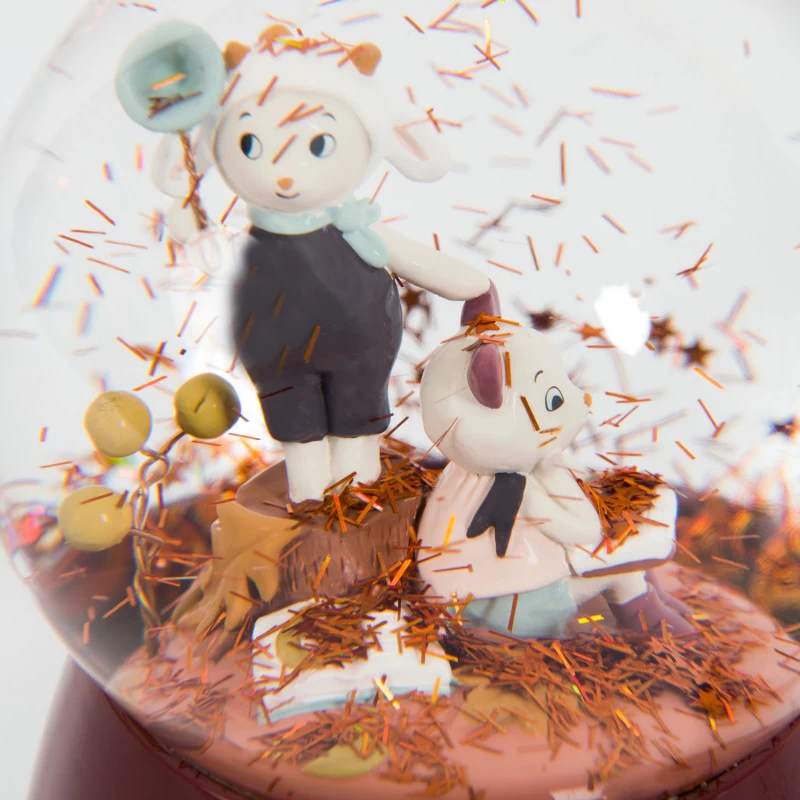 Dans cette magnifique boule à neige musicale Moulin Roty Après la pluie, retrouvez Brume la souris en pleine lecture, accompagnée du petit mouton Nuage cherchant à attraper les délicates paillettes brillantes. Le globe transparent est posé sur un magnifique socle couleur terre cuite, illustré de motifs rappelant l’ambiance fantaisiste de la collection Après la pluie.