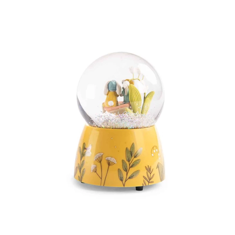 Dans cette superbe boule à neige musicale Trois Petits Lapins de Moulin Roty, retrouvez deux petits lapins et leurs amis la tortue et le hérisson dans un beau jardin, au milieu des paillettes holographiques, partageant le thé assis sur un champignon ! Le globe transparent est posé sur un socle jaune, joliment illustré de motifs floraux.