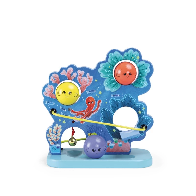 Avec la cascade de boules Les aventures de Paulie par Moulin Roty, les poissons de la collection ont inventĂ© un nouveau jeu : dĂ©valer des cascades ! Ils roulent de coraux en coraux, sur les passerelles en faisant tinter la clochette Ă l’arrivĂ©e.Â