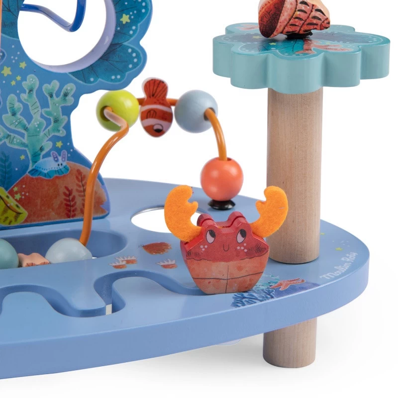 Sans oublier le gentil patit crabe à faire avancer le long de sa glissière et le miroir pour découvrir son reflet. Que d’activités proposées par le circuit de perles Dans la Jungle Moulin Roty !