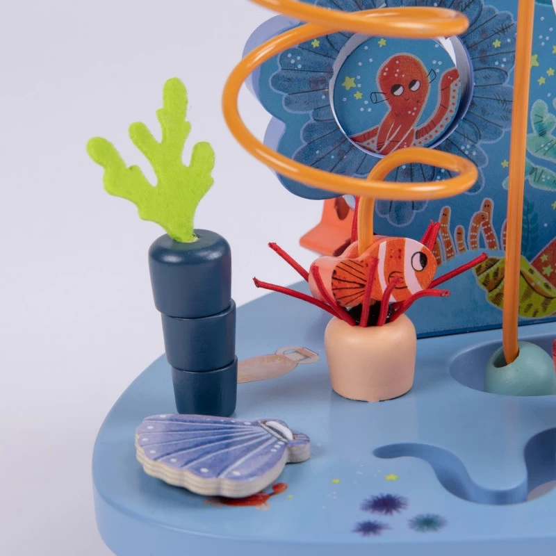 Le circuit de perles Les aventures de Paulie Moulin Roty est composé d’un socle en bois bleu, d’où émergent deux tiges métalliques pour y faire coulisser de jolies billes colorées et décorées, pour certaines en forme d’animaux et de coquillages. Glisser ces perles et les faire passer d’un étage à l’autre développe chez votre enfant la précision et la coordination de ses gestes.