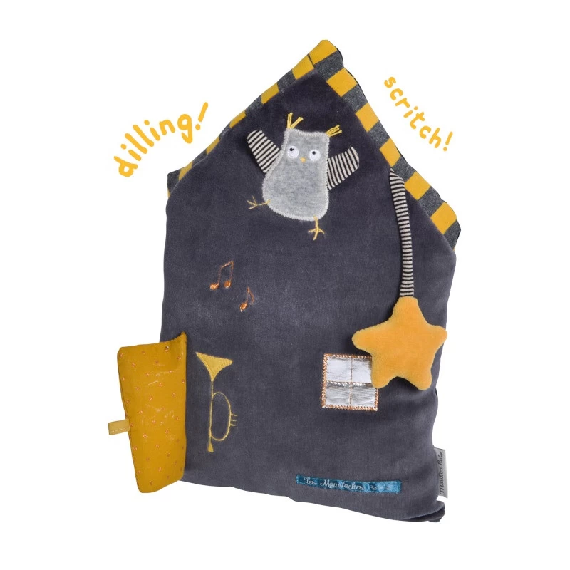 Le coussin d’activité en forme de maison assortie à la collection Les Moustaches par Moulin Roty est idéal pour l’éveil de votre tout petit ! Dans une dominante de gris avec quelques touches de jaune moutarde, elle est remplie de diverses activités : un hochet dans une étoile, des tissus qui font du bruit dans les ailes du hibou: tout ce qu’il faut pour amuser bébé dans un coussin en forme de maison !