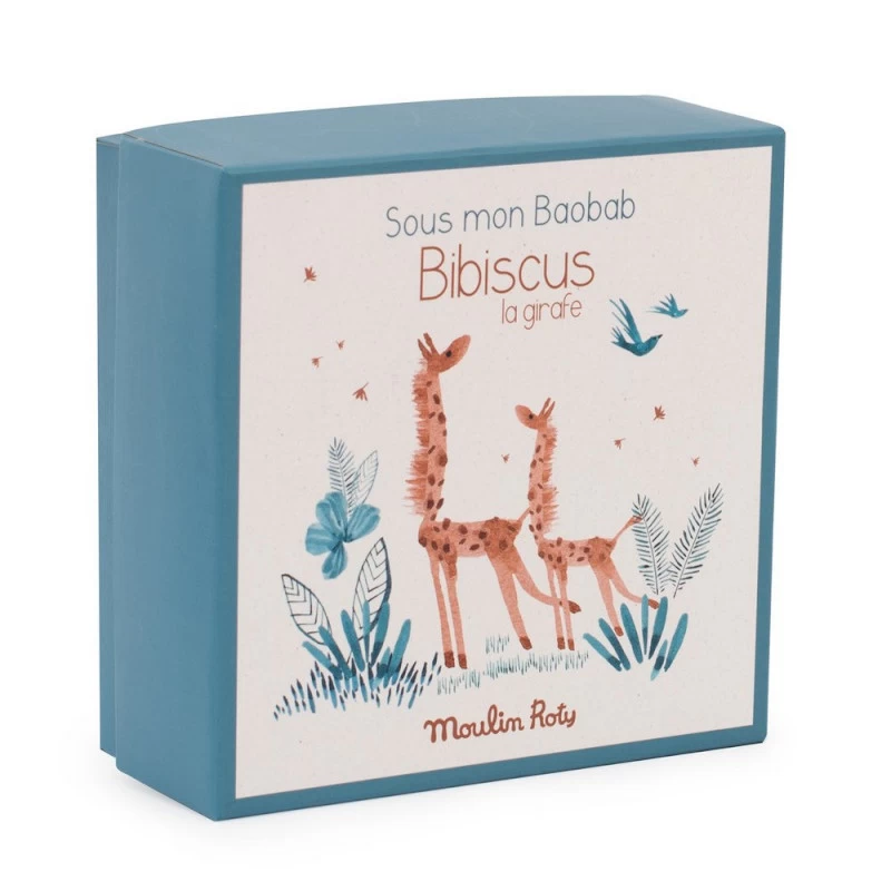 Entrez dans le monde tout doux de la collection Moulin Roty : « Sous mon baobab ». Ce superbe thème met en scène trois compagnons : Paprika le lion, Bibiscus la girafe et Bergamote l’éléphant qui évoluent avec tendresse dans la savane accompagnés d’un beau crocodile et d’un petit oiseau malicieux !