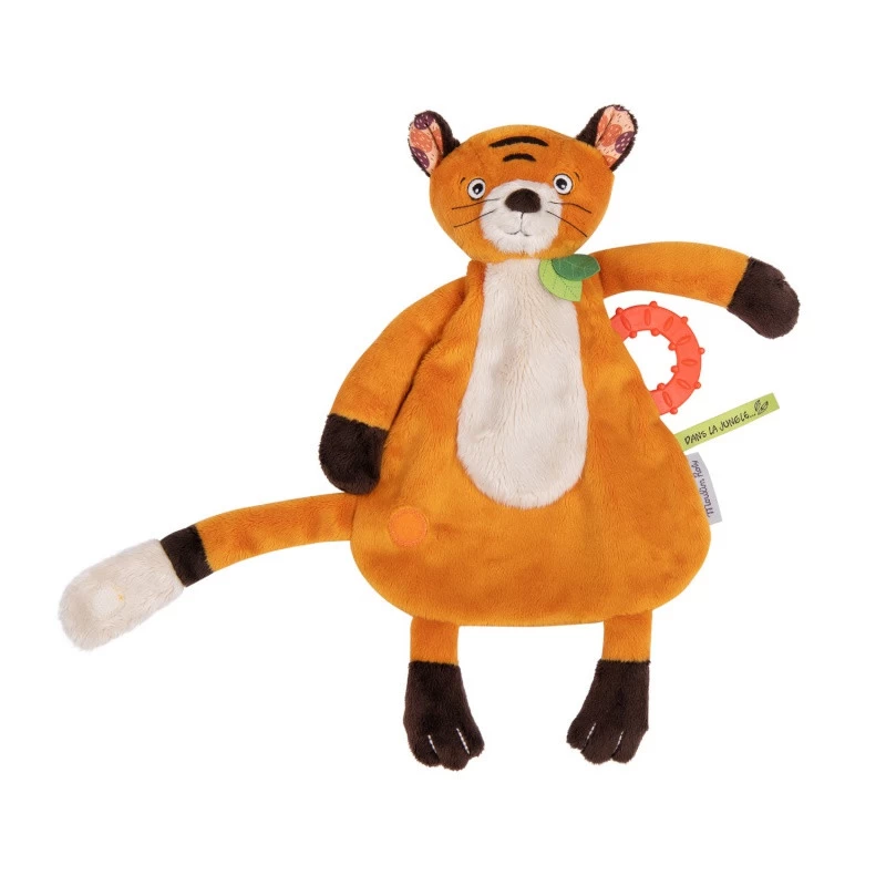 Le doudou Tiho le tigre Dans la jungle Moulin Roty inclut un anneau de dentition à mordiller si votre bébé a mal aux dents et une accroche à scratch pour retenir la sucette.