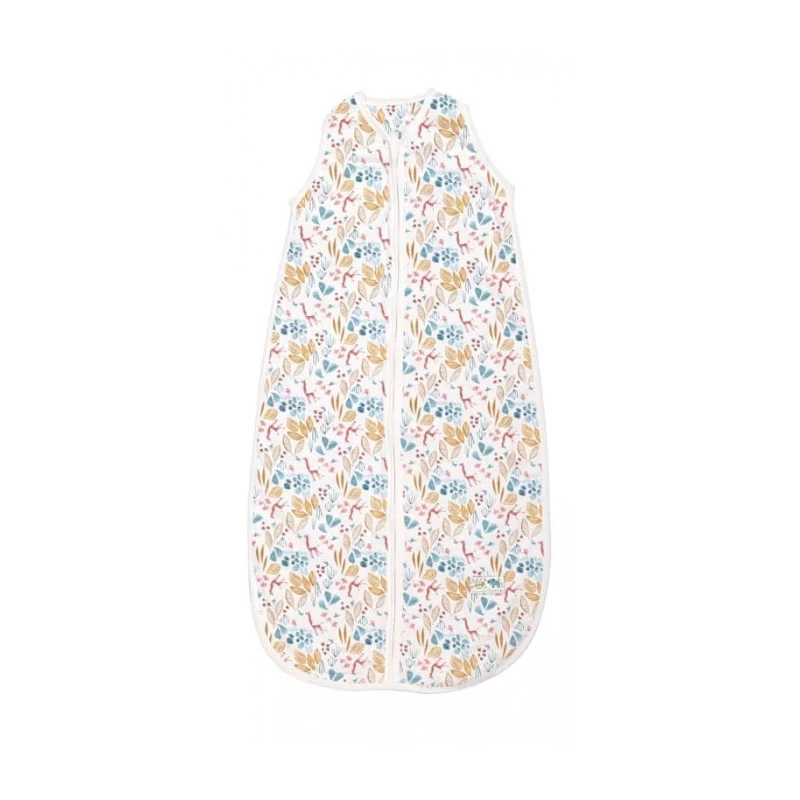 La gigoteuse 2ème âge été fleurs Sous mon baobab Moulin Roty est joliment imprimée de motifs floraux aux couleurs naturelles et minérales sur un fond blanc. Ils ont été spécialement dessinés à l’aquarelle pour cette collection où se mélangent l’ocre, le bleu et le terracotta.