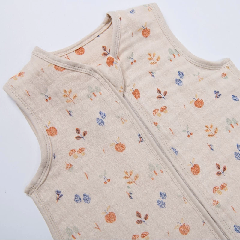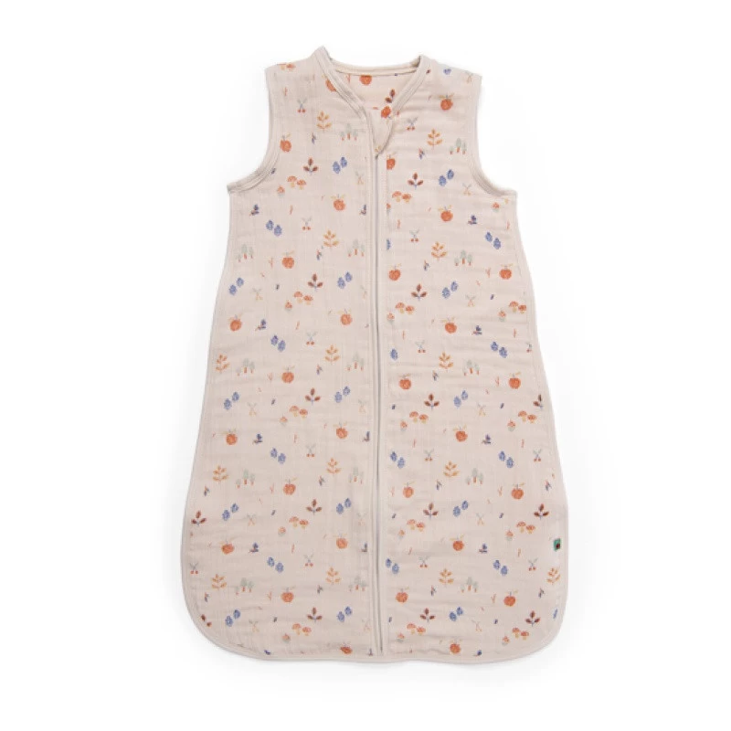 La gigoteuse 2e âge été Pomme des bois par Moulin Roty est réalisée en coton biologique pour laisser respirer la peau de bébé, dans une apaisante couleur crème et décorée d’un adorable imprimé cueillette avec différentes feuilles de la forêt, des champignons et des cerises.