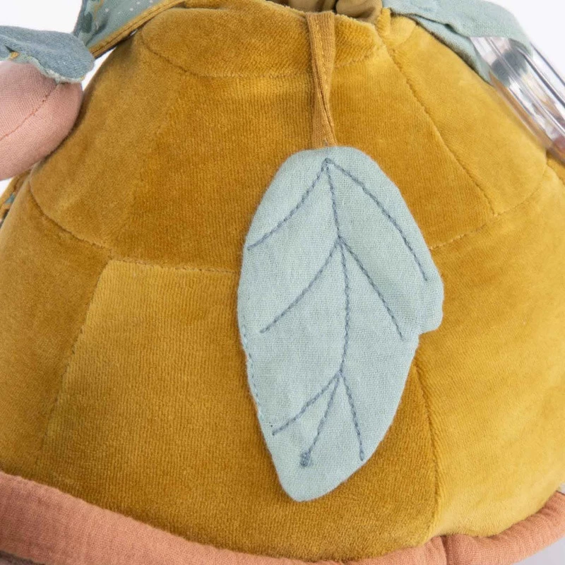 La grande tortue d’activités assortie à la collection Trois petits lapins de Moulin Roty est réalisé dans une superbe déclinaison d’ocre et taupe avec de jolies touches de bleu et de rose.