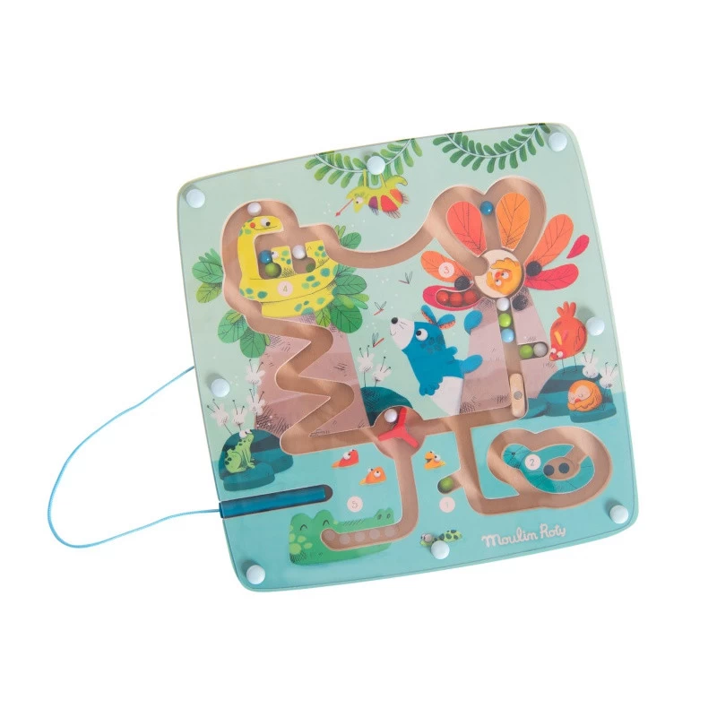 Avec le labyrinthe magnétique Dans la jungle de Moulin Roty, votre bout de chou exerce son sens de l’observation, sa capacité de concentration et d’analyse, sa coordination œil-main, sa faculté à effectuer des gestes précis… Il peut aussi apprendre à compter, à mémoriser les couleurs, le nom des animaux, à enrichir son vocabulaire… Même si l’objectif premier reste de s’amuser !