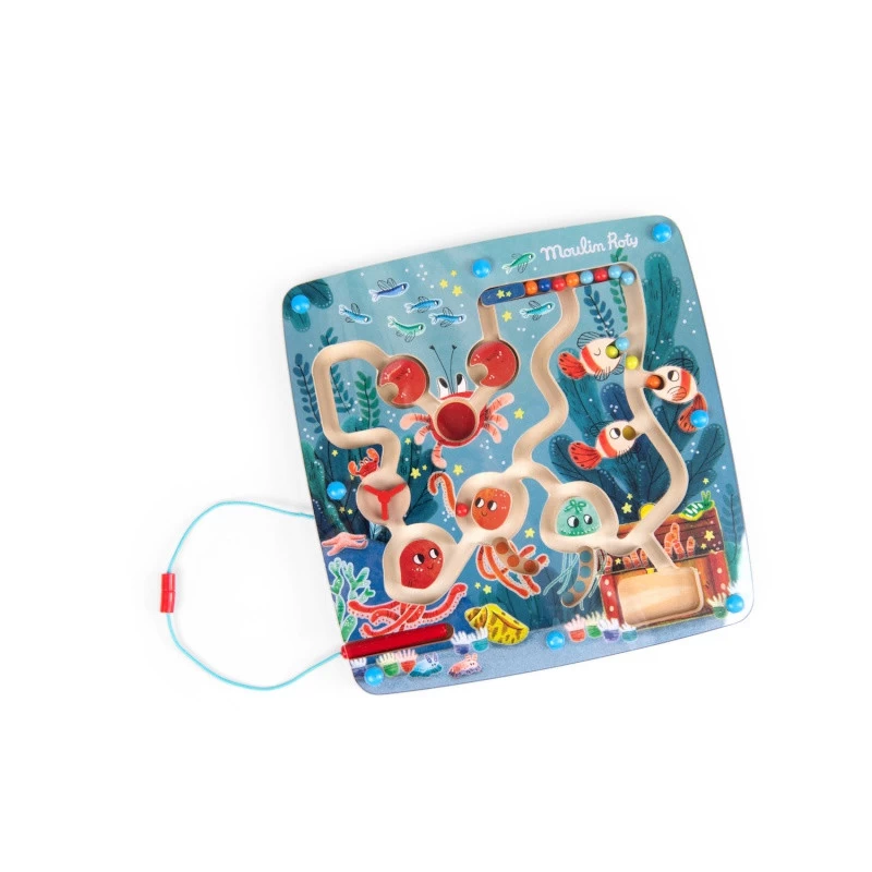 La collection Les aventures de Paulie de Moulin Roty est joyeusement colorée et remplie de gentils animaux marins. Elle réunit des jouets d’éveil rigolos pour divertir votre enfant, augmenter ses capacités et accompagner son développement. Parmi eux, découvrez ce ravissant labyrinthe magnétique aussi ludique qu’éducatif !