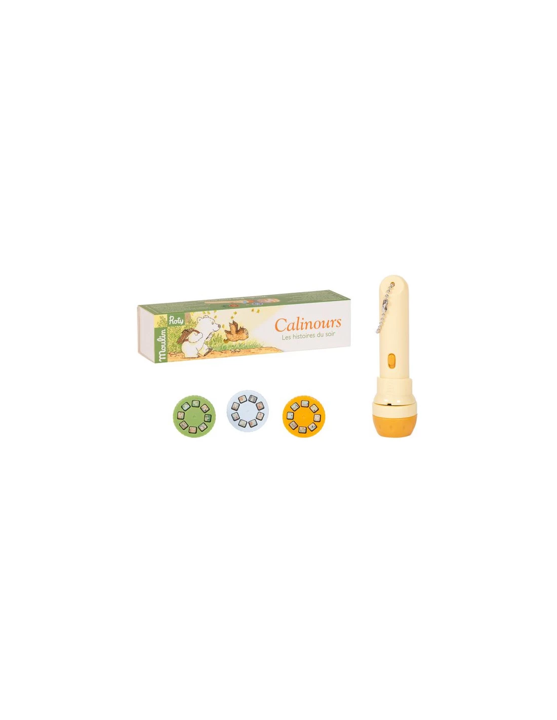 Découvrez la lampe à histoires Calinours de la collection L’école des loisirs de Moulin Roty, une lampe torche qui projette des images en couleurs pour raconter de jolies histoires à votre enfant. 3 disques, 3 histoires originales qui vont vous emporter dans les aventures de Calinours, l’ourson mignon, héros de l’école des loisirs créé par Alain Broutin et Frédéric Stehr.