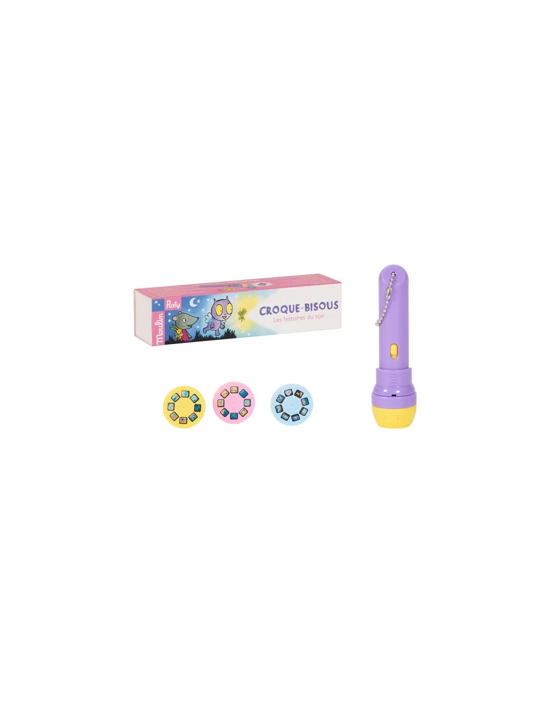 Découvrez la lampe à histoires Croque-Bisous de la collection L’école des loisirs de Moulin Roty, une lampe torche qui projette des images en couleurs, pour raconter de jolies histoires à votre enfant. 3 disques, 3 histoires originales qui vont vous emporter dans les aventures de Croque-Bisous, héros de l’école des loisirs créé par Kimiko.