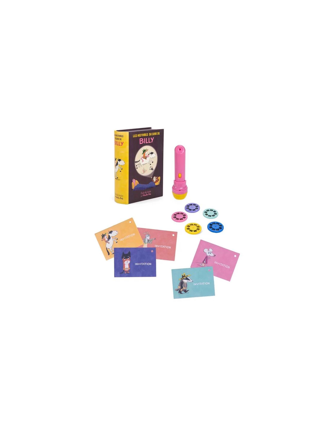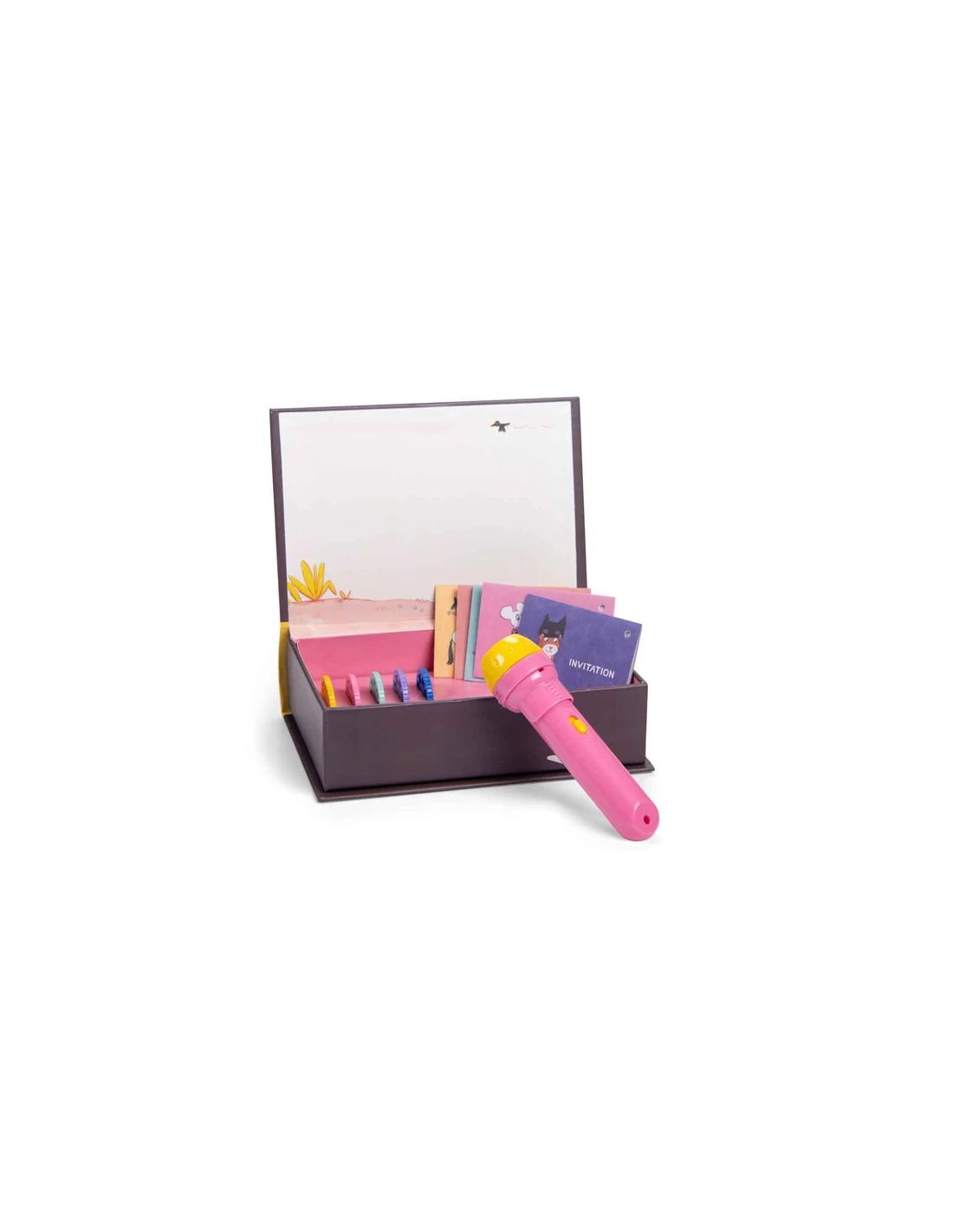 Insérez le disque choisi dans la fente, allumez la lampe, faîtes la mise en point et projetez l’image sur le livre, sur le mur ou le plafond, puis tournez le disque pour projeter les images suivantes de l’histoires.