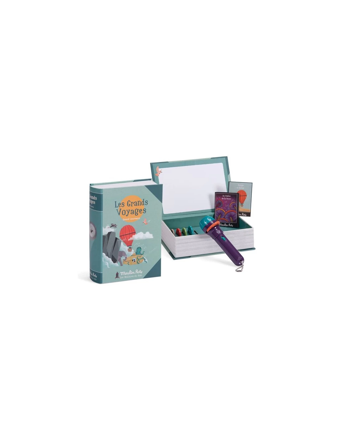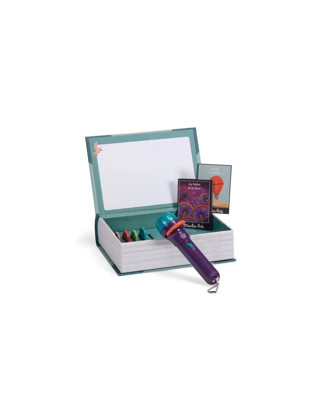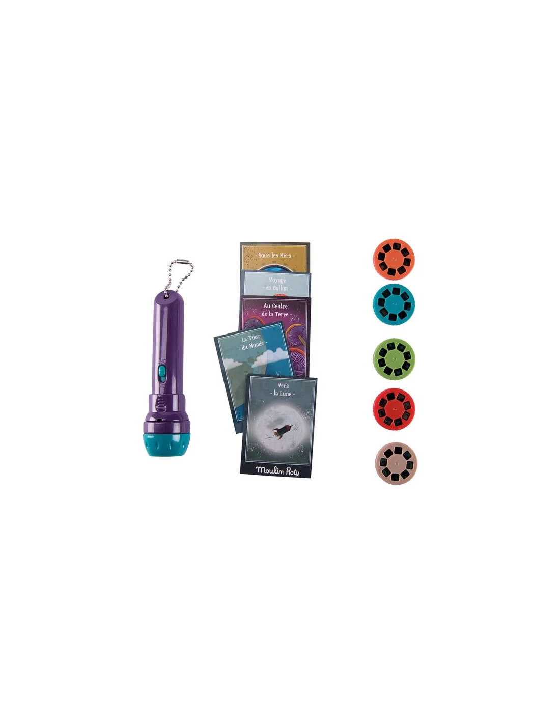 Insérez le disque choisi dans la fente, allumez la lampe, faîtes la mise en point et projetez l’image sur le livre, sur le mur ou le plafond, puis tournez le disque pour projeter les images suivantes de l’histoires.