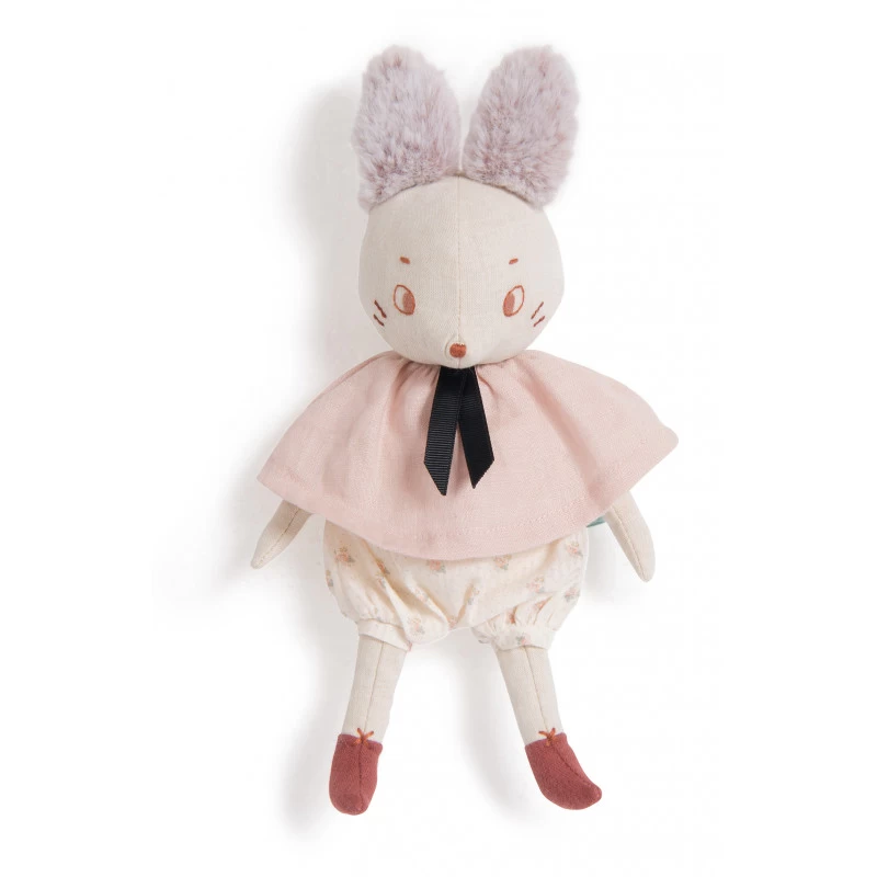 La peluche souris Moulin Roty Après la pluie a toutes les qualités pour faire un doudou parfait : une taille adaptée à de petites mains, de longues pattes pour bien le tenir, de fins détails contrastés faciles à distinguer, des matières douces et variées pour éveiller le toucher, comme la fourrure, le lin ou le lange en coton bio. Elle va vite devenir inséparable de votre petite fille et saura la rassurer par sa simple présence, la réconforter en cas de gros chagrin, et l’apaiser quand il faut s’endormir.