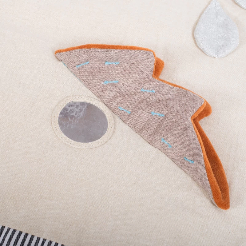 On peut dire que ce jouet original fait la pluie et le beau temps ! Bien molletonné, réalisé en tissu chambray crème bordé de fines rayures, le tapis d’éveil Moulin Roty Après la pluie regorge de multiples activités à découvrir avec la météo : des feuilles aux couleurs d’automne qui font scritch-scritch, un magnifique arc-en-ciel irisé, des nuages tout doux, des gouttes de pluie en relief, de délicats flocons ou de fins filaments tombant du ciel, sans oublier un lapin à grelot dans sa tasse de thé, un miroir caché ou un anneau à billes à l’abri dans une pomme.