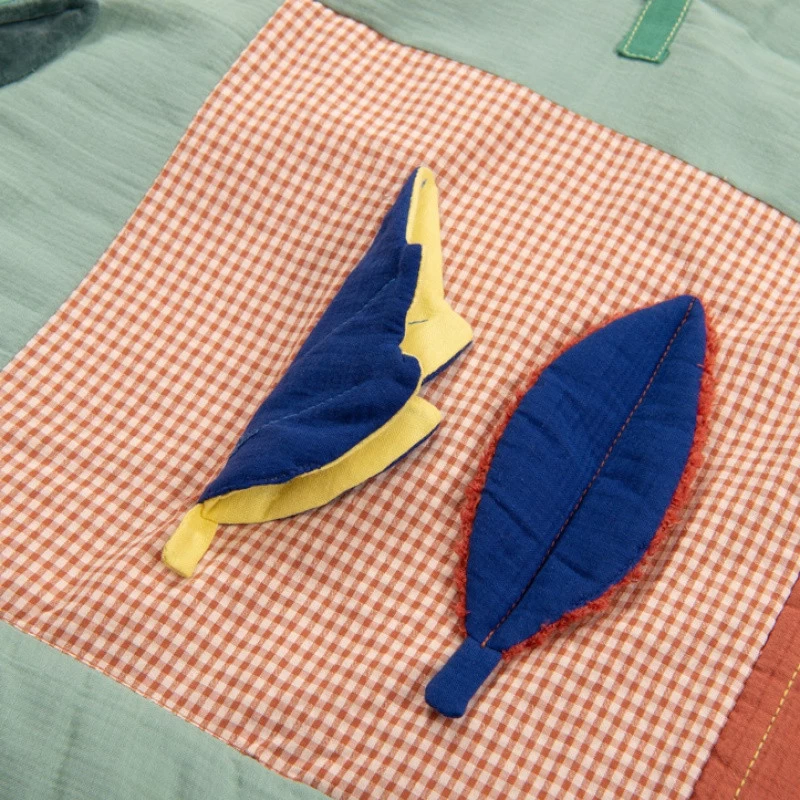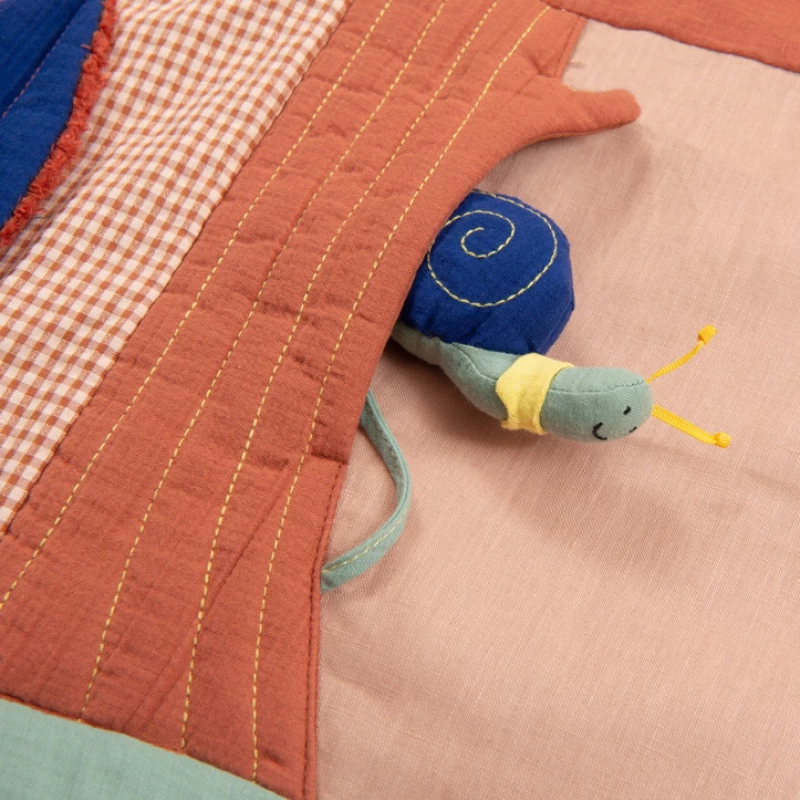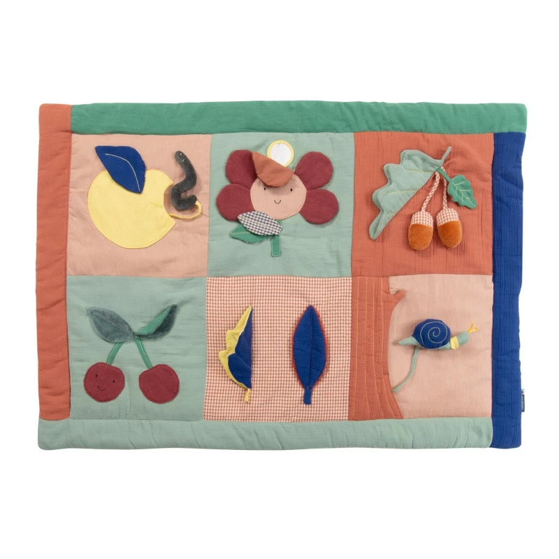 Bien molletonné, le tapis d’éveil Pomme des bois de Moulin Roty regorge de multiples activités à découvrir : un petit vers de terre caché dans une pomme, une belle fleur à manipuler, un miroir, de petits glands, des cerises et différentes feuilles qui font scritch scritch ainsi qu’un petit escargot qui fait un bruit rigolo !