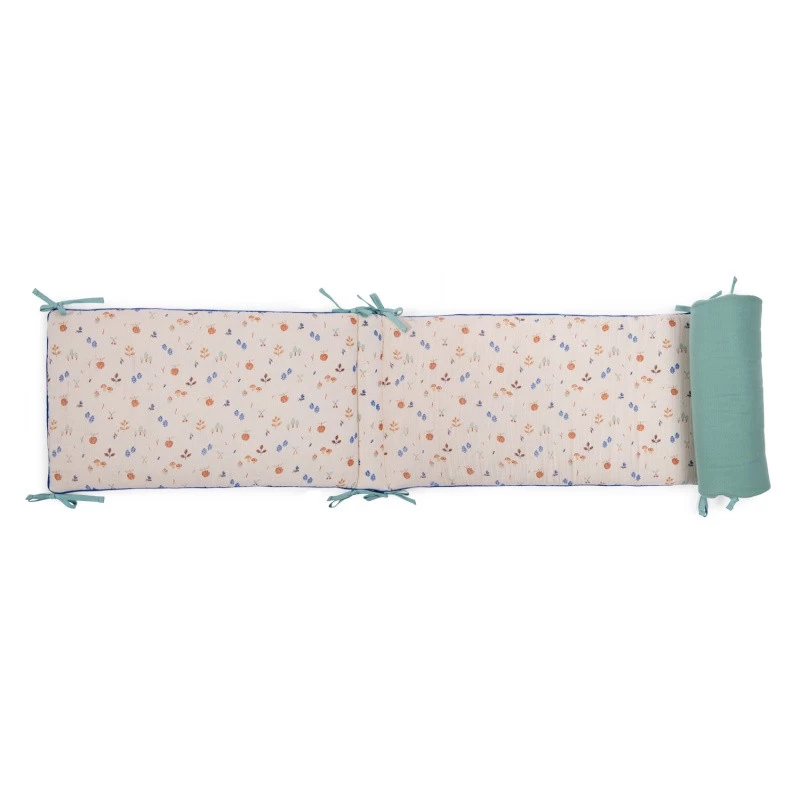 Ce joli tour de lit Moulin Roty Pomme des bois est réalisé en tissu 100% coton, double épaisseur, offrant ainsi à votre bébé un contact agréable et doux. Il est parsemé d’un bel imprimé cueillette sur un fond crème d’un côté et vert sauge de l’autre. De plus, il est mis en valeur par un liseré contrasté bleu également utilisée sur les draps housses de la même collection.